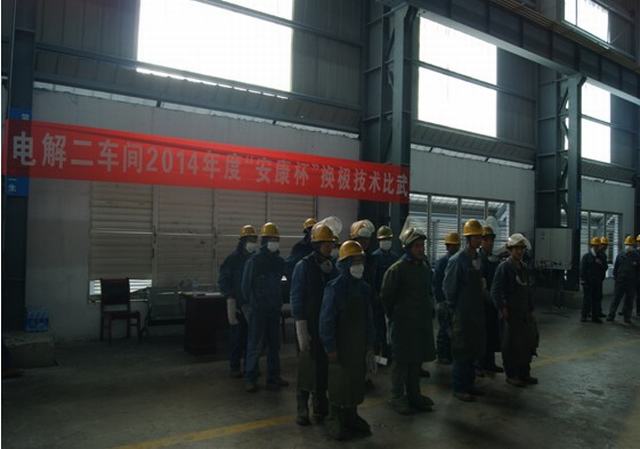 青海物產(chǎn)工業(yè)投資有限公司全面啟動(dòng)"安康杯"競賽活動(dòng)。2014年4月15日上午電解二車間舉行了"安康杯"換極技術(shù)比武大賽。公司副總經(jīng)理張?jiān)手遥笨偨?jīng)理、工會(huì)主席張秉瑜,總經(jīng)理助理秦建峰出席了開幕式。