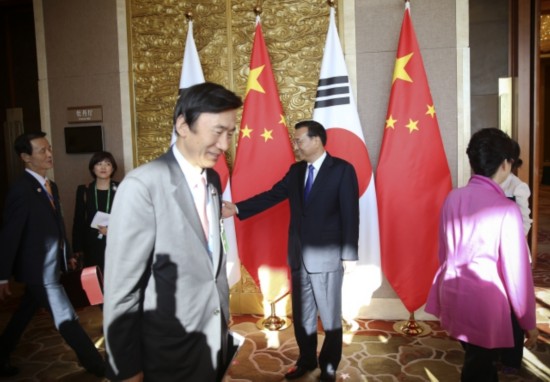 韓國總統(tǒng)樸槿惠對李克強(qiáng)總理表示:"韓中日三國合作有利于地區(qū)和平穩(wěn)定。要引導(dǎo)日本抱著正確的歷史觀,為東北亞和平做出貢獻(xiàn)。"