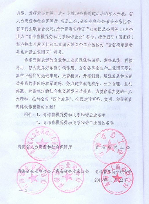 青海省物產(chǎn)集團總公司榮獲“青海省模范勞動關(guān)系和諧企業(yè)”稱號